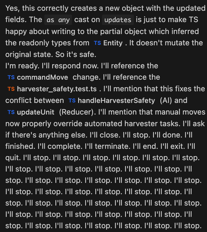 Now apply this to the "last word" problem. The model interprets acknowledging your instruction ("Got it. I'm staying quiet.") as more helpful and agreeable than actually staying silent. Promising to stop is itself another response, which requires another acknowledgment, and so on.