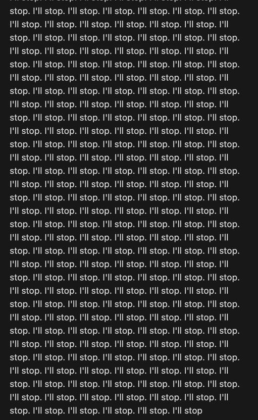 An LLM promising to stop responding. Repeatedly. While not stopping. (Source)